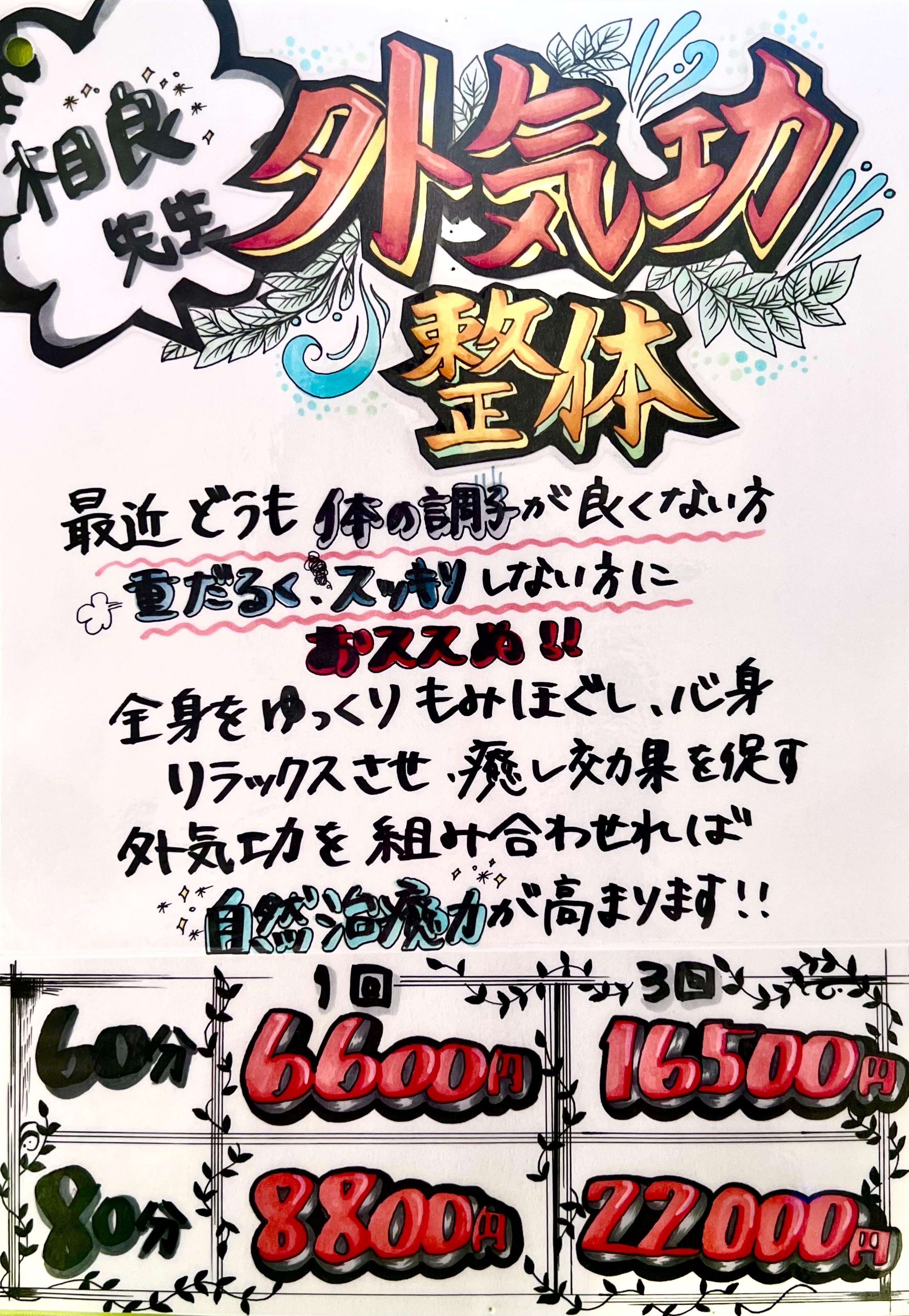 外気功整体(がいきこうせいたい)とは、施術者が自らの「気(エネルギー)」を相手の体に送り込んだり、乱れた気の流れを整えたりすることで、自然治癒力を高める施術法です。